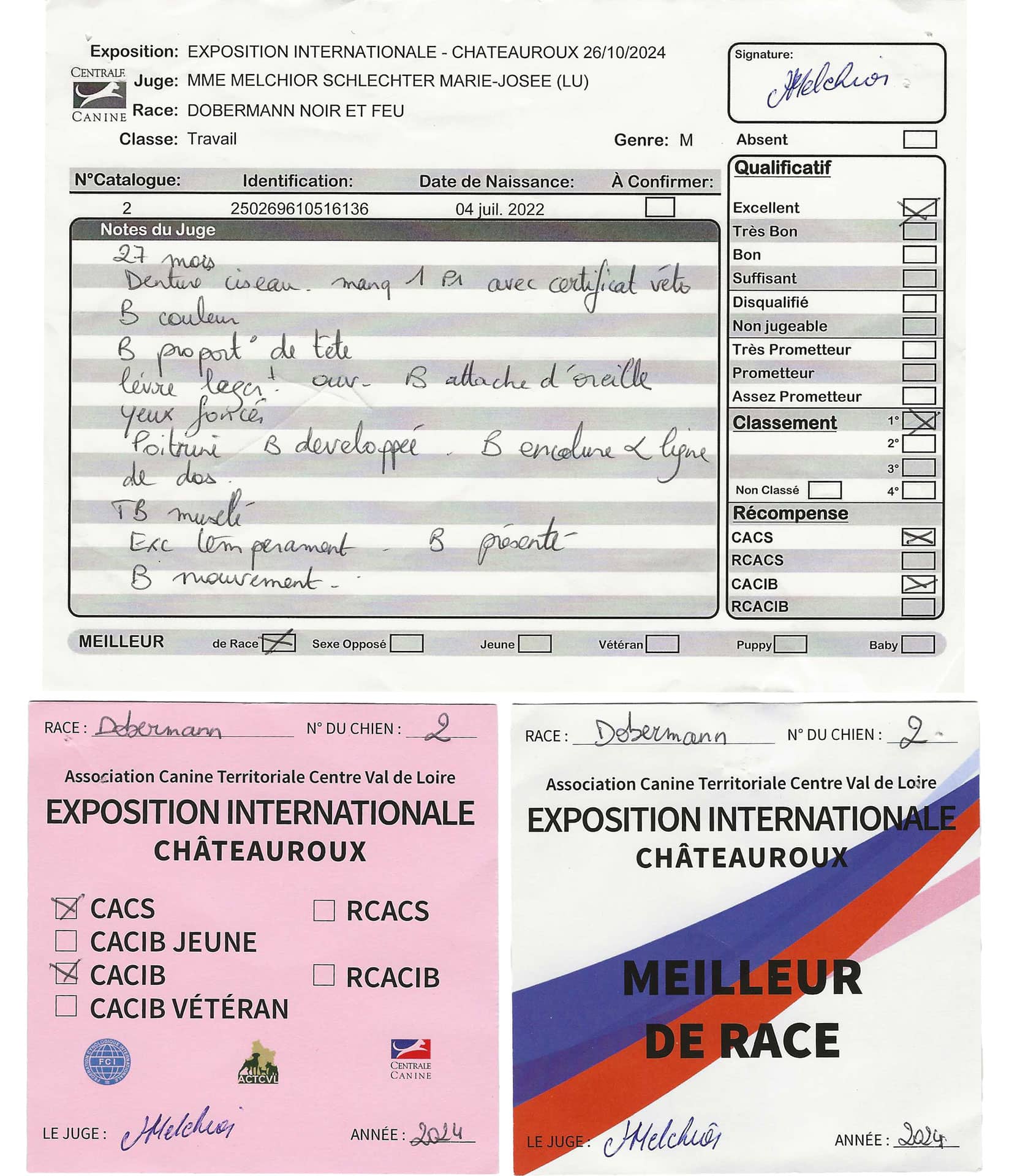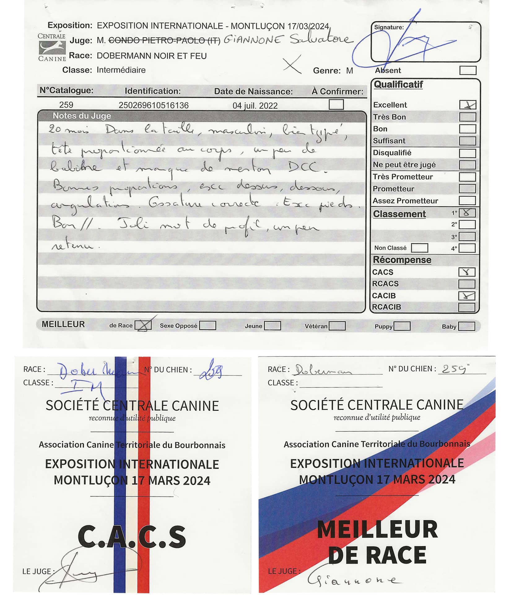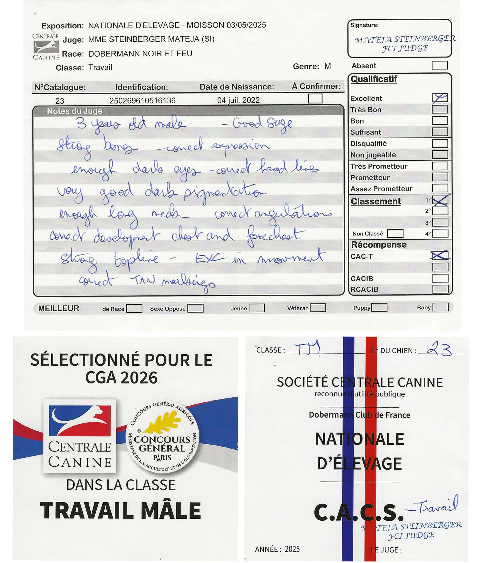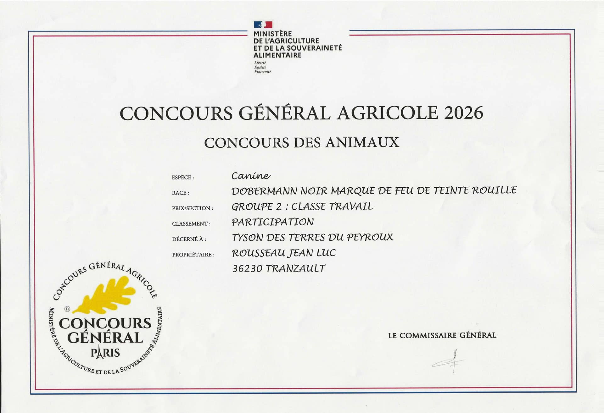 Tyson s’est distingué lors de plusieurs concours nationaux et internationaux, dont une spéciale Dobermann ainsi que la Nationale d’Élevage. Ces résultats lui permettent d’accéder à la classe Champion et lui ont ouvert les portes du prestigieux Concours Général Agricole du Salon International de l’Agriculture.