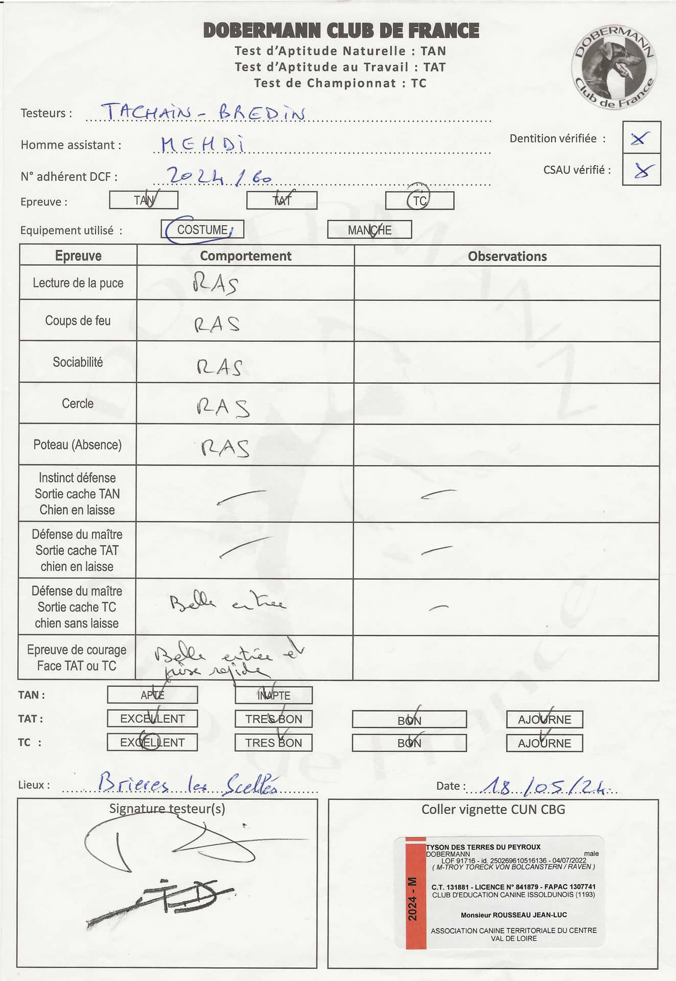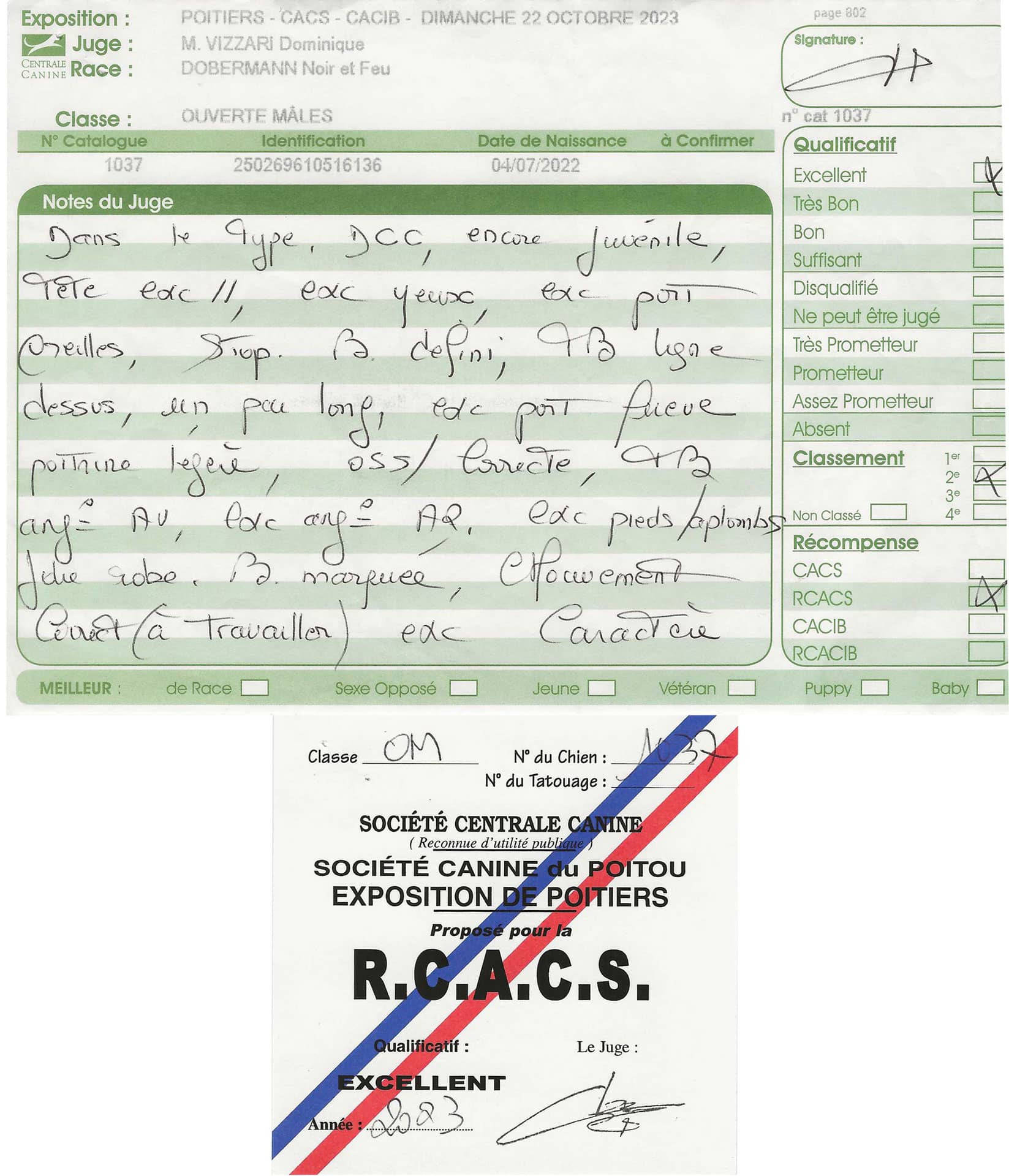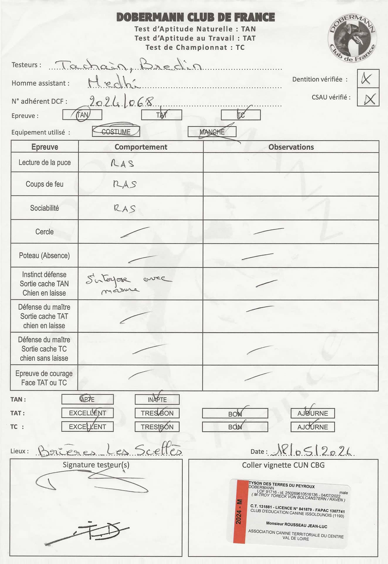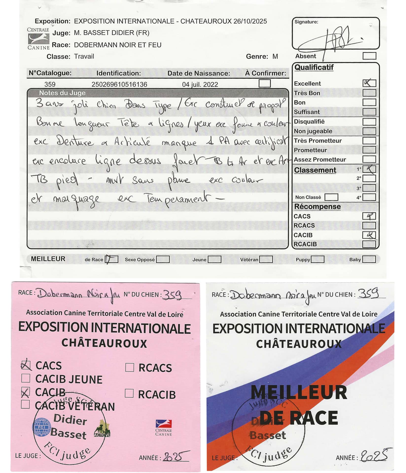 Tyson s’est distingué lors de plusieurs concours nationaux et internationaux, dont une spéciale Dobermann ainsi que la Nationale d’Élevage. Ces résultats lui permettent d’accéder à la classe Champion et lui ont ouvert les portes du prestigieux Concours Général Agricole du Salon International de l’Agriculture.